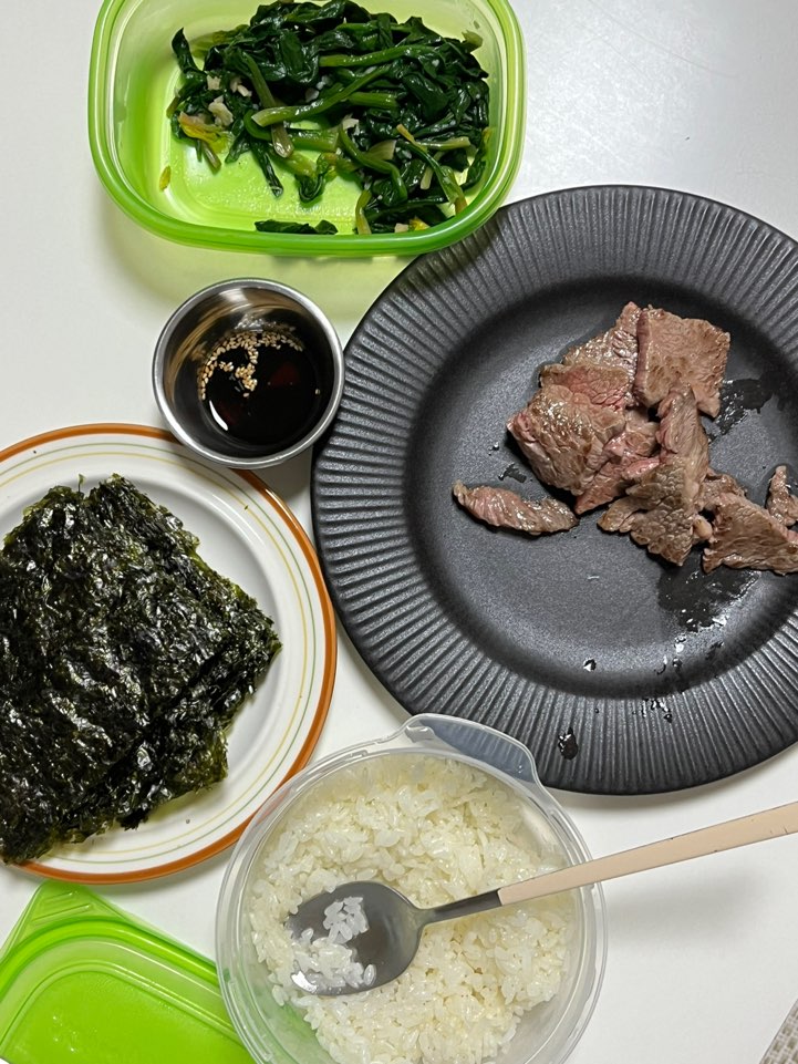 저녁부터 쌀밥에 생김 그리고 소고기구이를 먹었는데